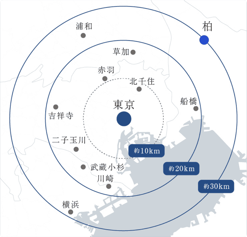 「柏」駅、「新柏」駅、「南柏」駅など東武アーバンパークラインとJR常磐線の2路線3駅が利用可能。